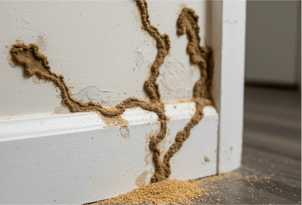 - Mud tubes on walls, foundations, or wooden structures.